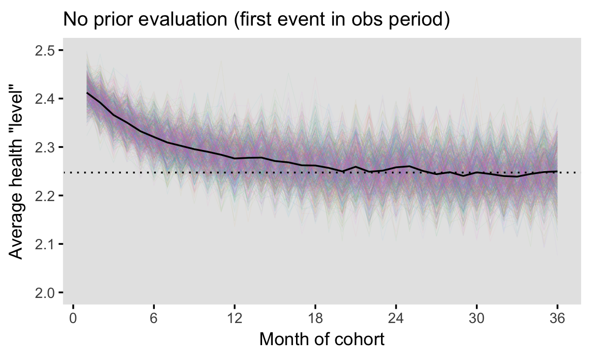 Finally, we are at the point where we can see what, if any, bias results in selecting our cohorts under the scenario I’ve outlined above. We start by generating multiple iterations of populations and cohorts and estimating average health status by month under the assumption that we will have a look-back period of 0. That is, we will accept an individual into the first possible cohort regardless of her previous emergency department visit history. The plot below shows average across 1000 iterations. What we see is that the average health status of the cohorts in the first 20 months or so exceed the long run average. The incidence - prevalence bias is extremely strong if we ignore prior ED history!